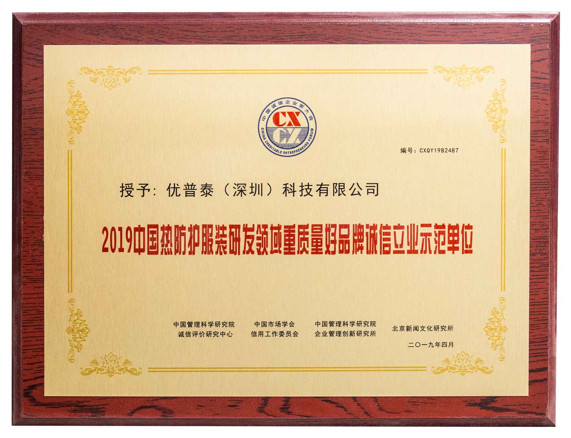 2019中国热防护服装研发领域质量好品牌诚信立业示范单位