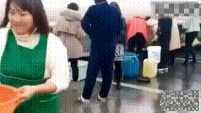 附近居民拿着桶、盆等容器