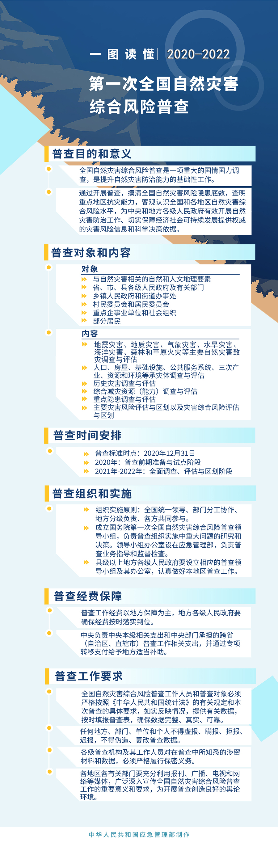 过去一年多来,应急管理部会同多个部门和单位,组建了全国自然灾害综合风险普查技术组,凝聚100余位专家的力量,论证编制普查相关方案。普查方案明确了三个基本目标,分别是:摸清全国自然灾害风险隐患底数,查明重点区域抗灾能力,客观认识全国和各地区自然灾害综合风险水平。