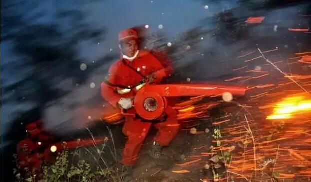 重重的水枪压在肩上,咬牙、蹬脚、呐喊,扛起水枪前往危险的方向。