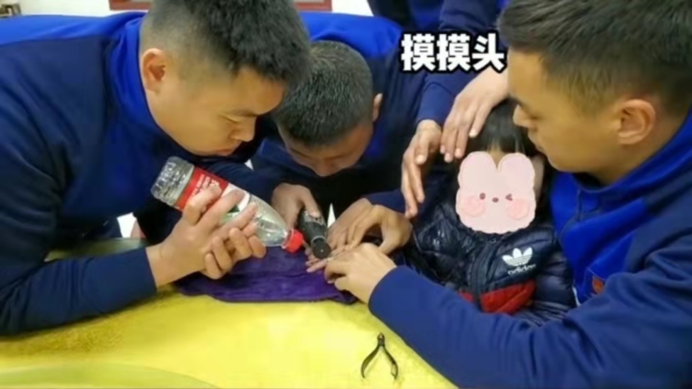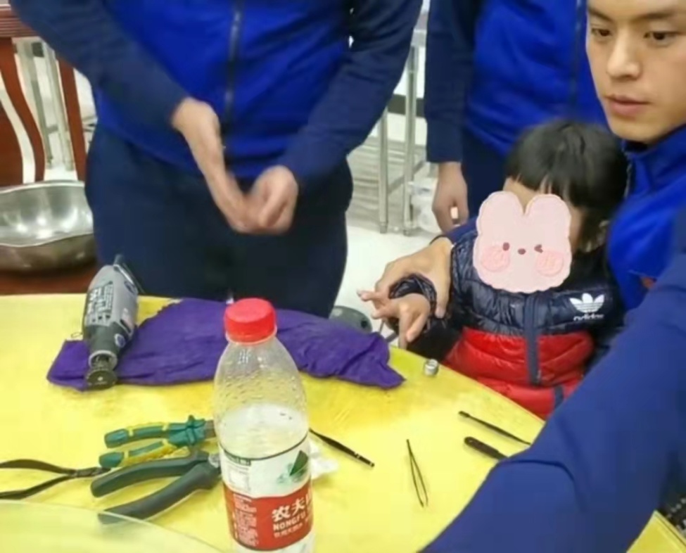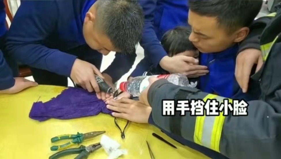 消防员们查看一番后,便用斜嘴钳进行剪切,因管道太硬剪不动,又拿出小型手持电动打磨机进行切割。为了安全起见,救援人员将一个小铁片插入管道内,边切割边用水降温,防止对小女孩造成二次伤害。“乖,不痛不痛,蒙起眼睛就不痛了,我们勇敢一点好不好?马上就要剪开了。”操作时,由于小女孩很害怕不停地哭 ,救援人员一边用手挡在她面前进行保护,一边给她喂糖并进行鼓励。20分钟后,卡在小女孩手上的东西被成功取出。
