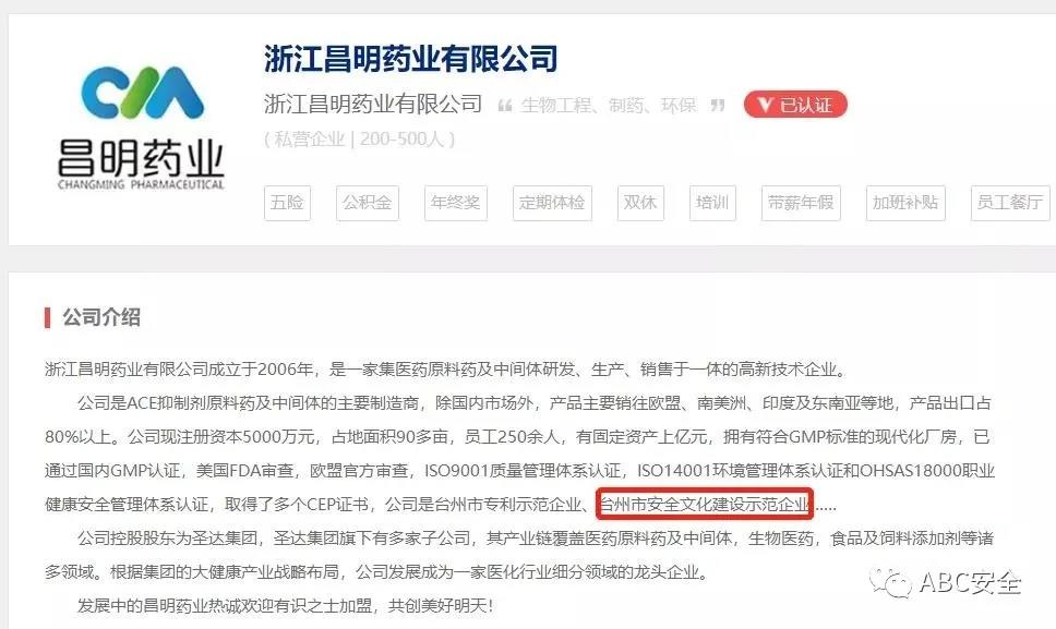 据某人才网站显示,昌明药业有限公司,是一家于2006年09月13日在天台县工商行政管理局登记成立,集医药原料药及中间体研发、生产、销售于一体的高新技术企业。主要从事ACE抑制剂原料药及中间体的生产,其产品除了在国内销售之外,还广泛出口于欧盟、南美洲、印度及东南亚等地,出口率达到了80%以上。